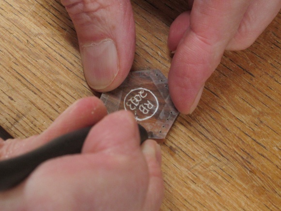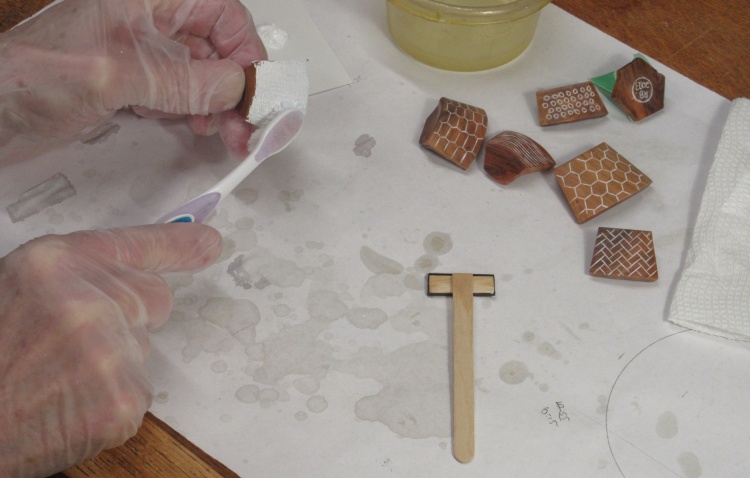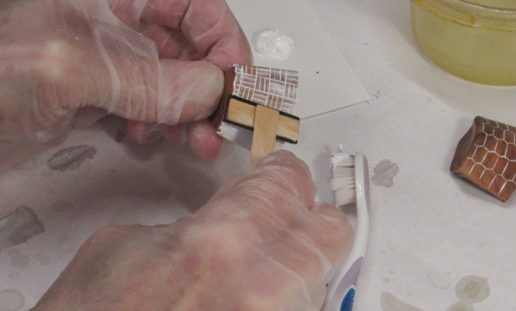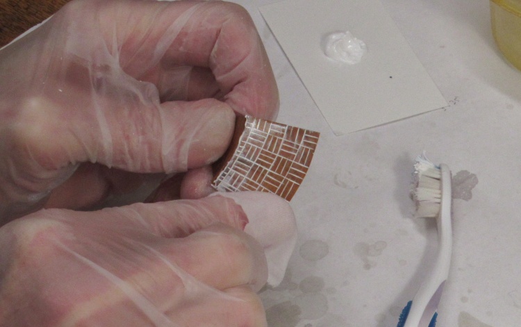 Here I'm spreading it over the surface of one of the patches with an old toothbrush to make sure it gets into the carved lines.
