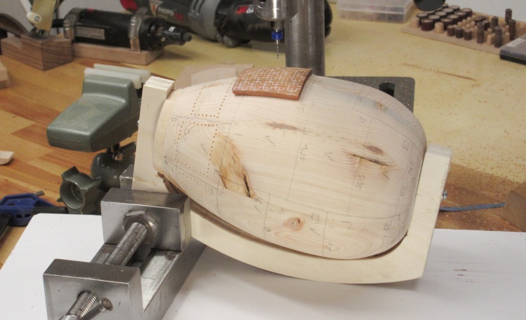 Then it was on to the main-body pieces. To hold them in place I repurposed the dummy vessel by cutting off the neck and mounting it to a plywood frame on which it could rotate.