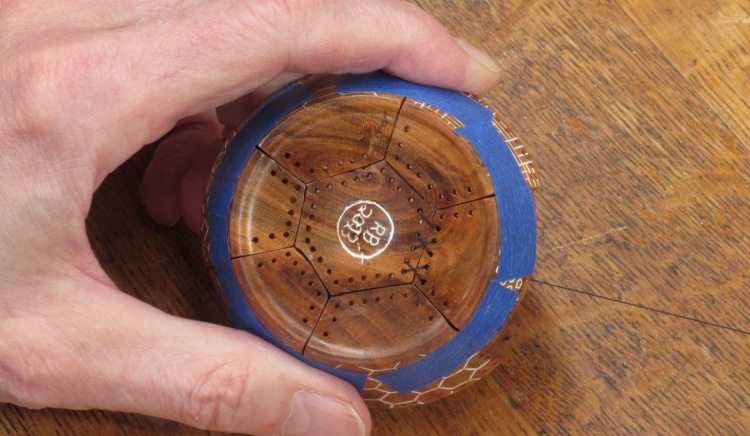 So much for the easy stuff. The next step was figuring out how arrange the hole positions for the eventual sewing operation. In order that holes lined up across joints and there were no spare holes, I decided I needed to mark them. All. I started with the bottom ring of six pieces with the hexagonal patch #37 in the middle.