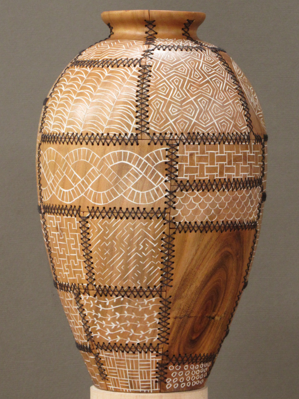 To make a vessel composed of "patches" of wood, I suppose one could have made each patch independently, but that goes beyond painstaking and into bizarrely involved. Instead, I satisfied my turning urges by making the target vessel and then cut the patches out of that, guaranteeing a decent fit. And saving a year or two of work.