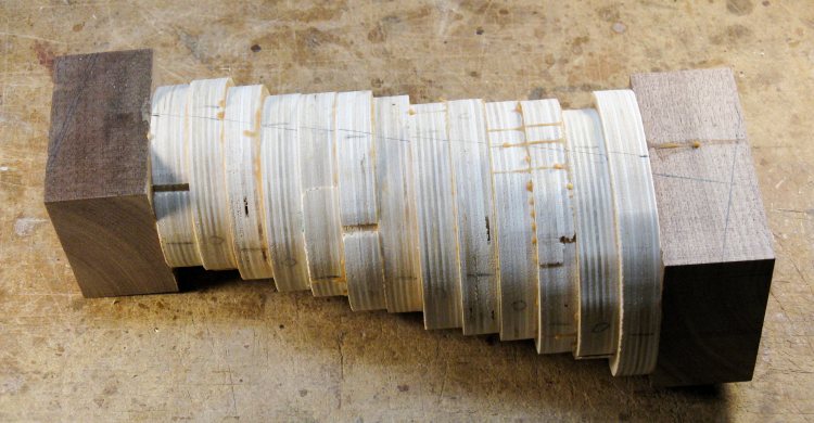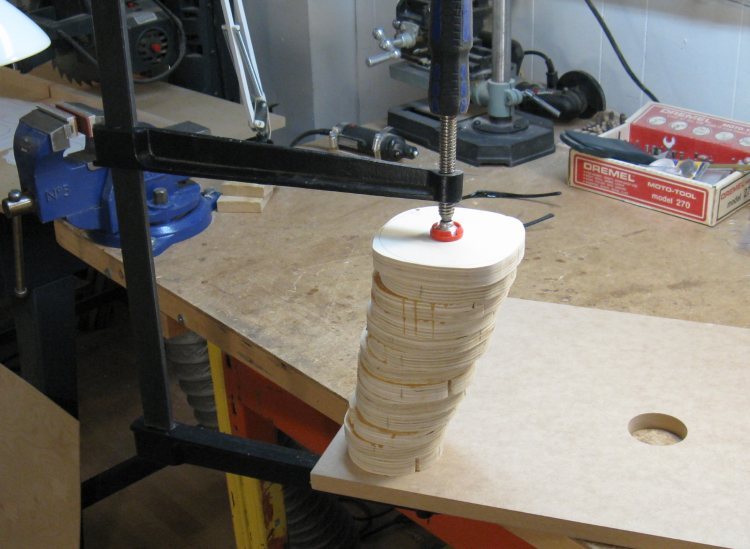 After enough sets of three were together, those were combined to form the full stack. In this shot they have been glued and are enjoying the attention of my deepest clamp.