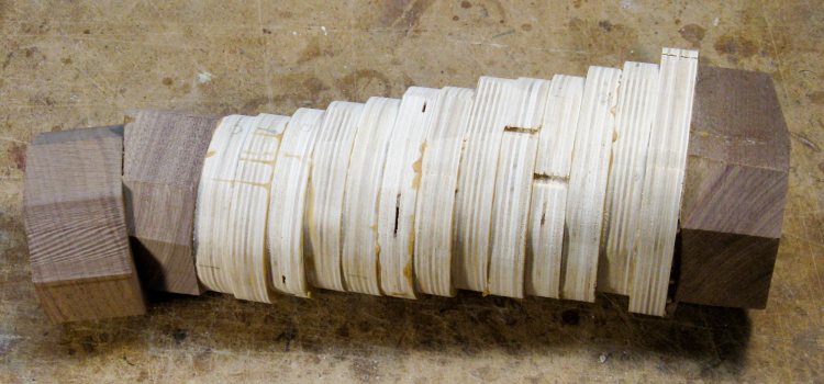 Since it is very difficult to try to glue and clamp things on an angle, I left off the top and bottom caps and just stacked them in a staggered manner. When that staggered stack was tilted 15 degrees, it would look like the arrangement in the plan.