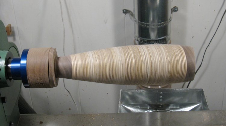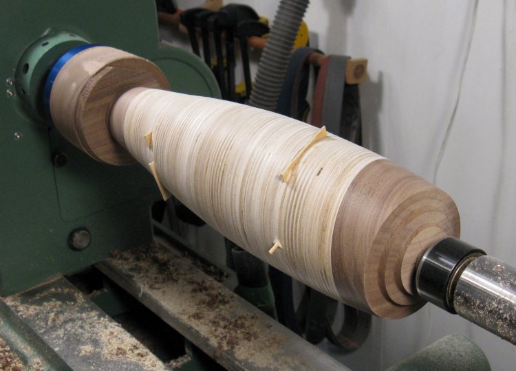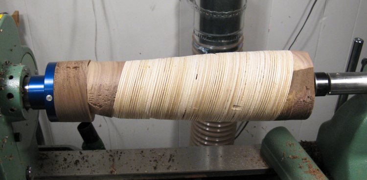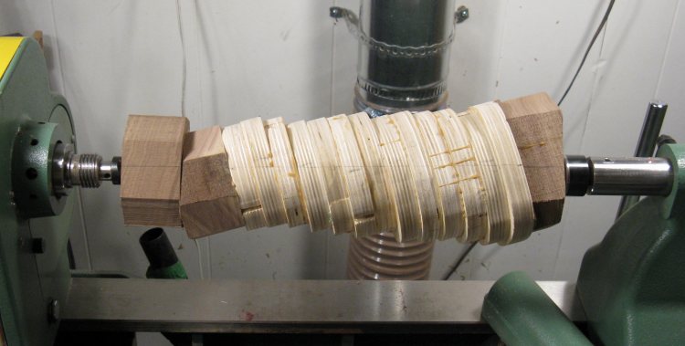 The end caps have been glued on in this shot. It is almost ready to turn except it needs a mounting piece on the bottom to give the faceplate somewhere to screw in to. The center line of the vessel has been drawn on and the ends will be cut at the appropriate angle so they are perpendicular to the axis for easier turning.