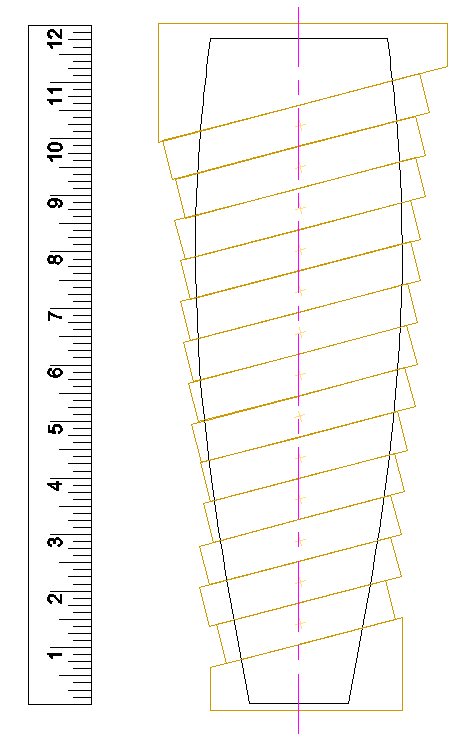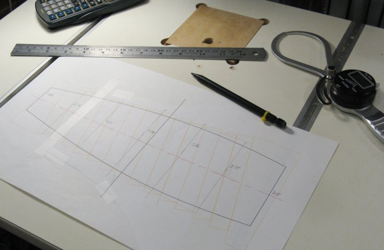 I usually print a full-sized plan since that makes it easy to transfer measurements. Here I've drawn lines every couple of inches along the plan and measured the diameter at each line. Those diameters will be transferred to the wood to guide the shape.