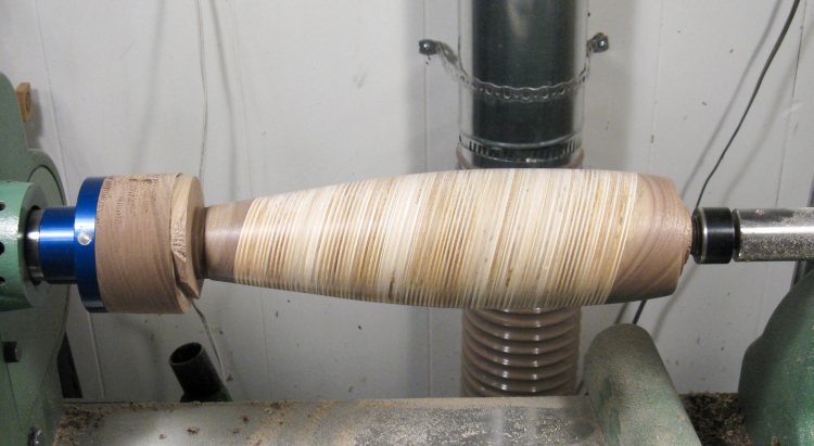 I marked the center of the vessel as accurately as possible (which was "not very" given the funky angle and the irregular surfaces) and mounted it on the lathe between the drive spur and live center.
