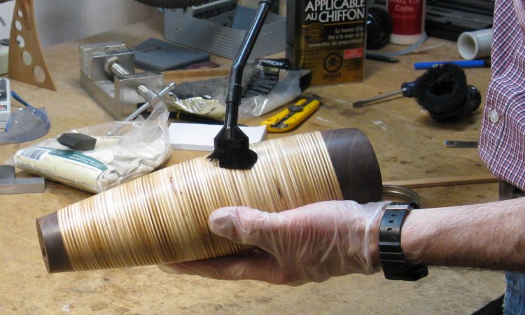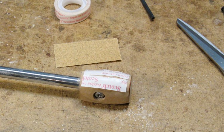 Once the hollowing was done, I sanded the inside using a tool modified to be a deep sonding jig. Here some double-sided tape is added to the rounded end in preparation for sticking on a small piece of sandpaper.