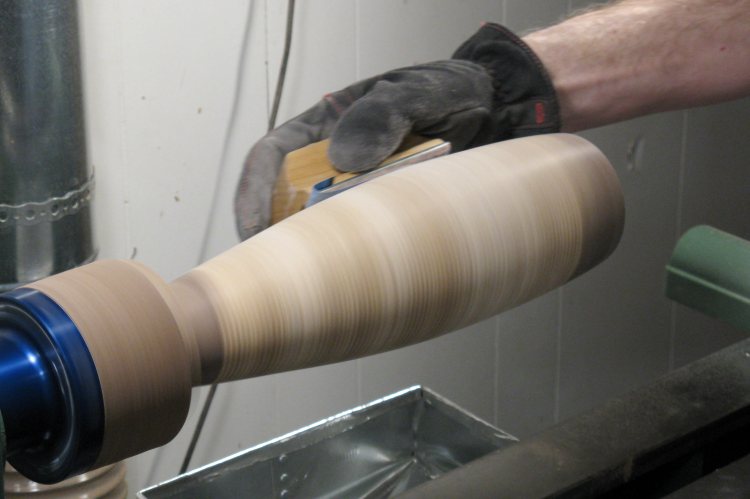 After the inside was done, I removed the steady rest and re-sanded the outside, mostly using a flat sanding block.