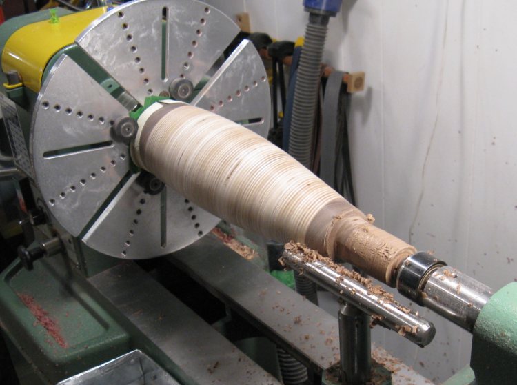 In this shot, the mounting block has been partially removed. That will be completed and the bottom hollowed a bit to form a foot flush with the outside of the vessel.