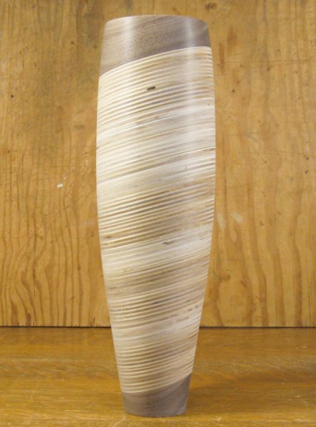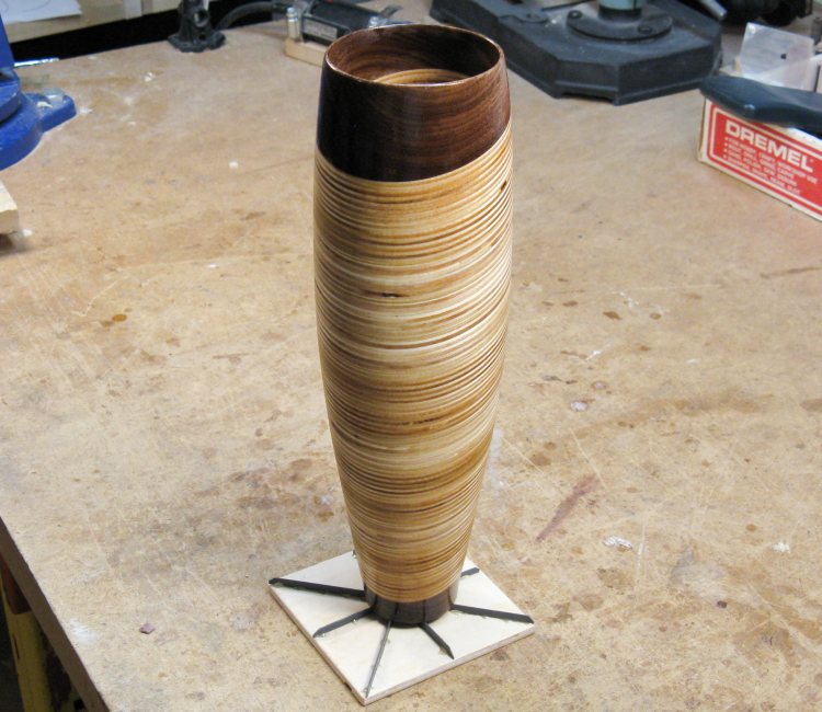 irregular vessel that produced the scraps. That one took a significant amount of shaping and sanding so that even with power tools I needed to break the work up into 15-minute sessions since that was about as long as my wrist lasted holding the power sander. So this vessel gave me something easier to work on in parallel.