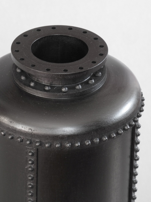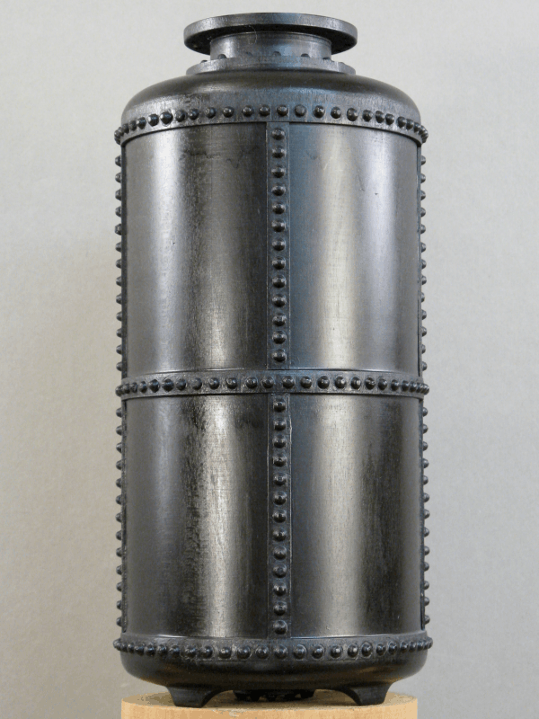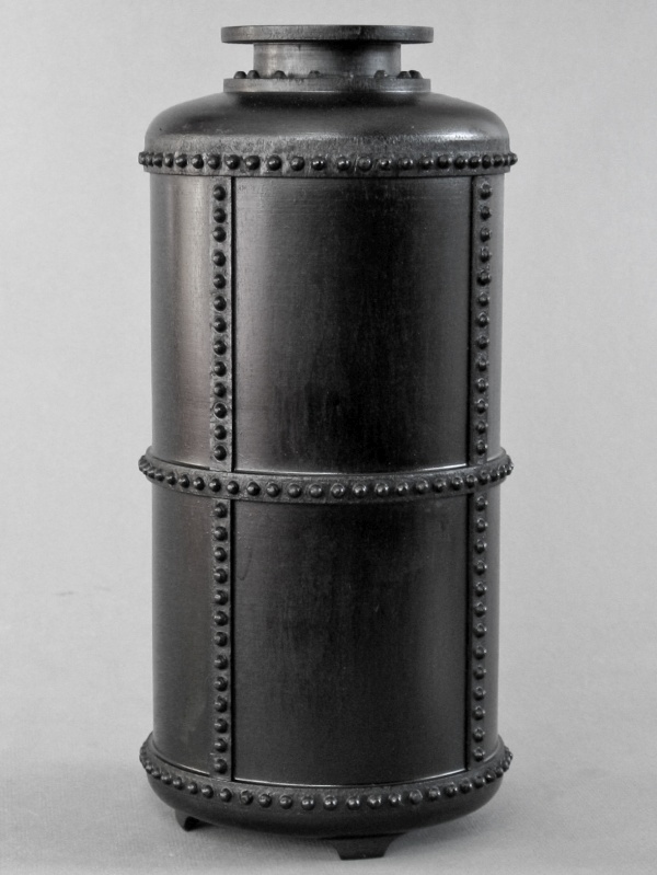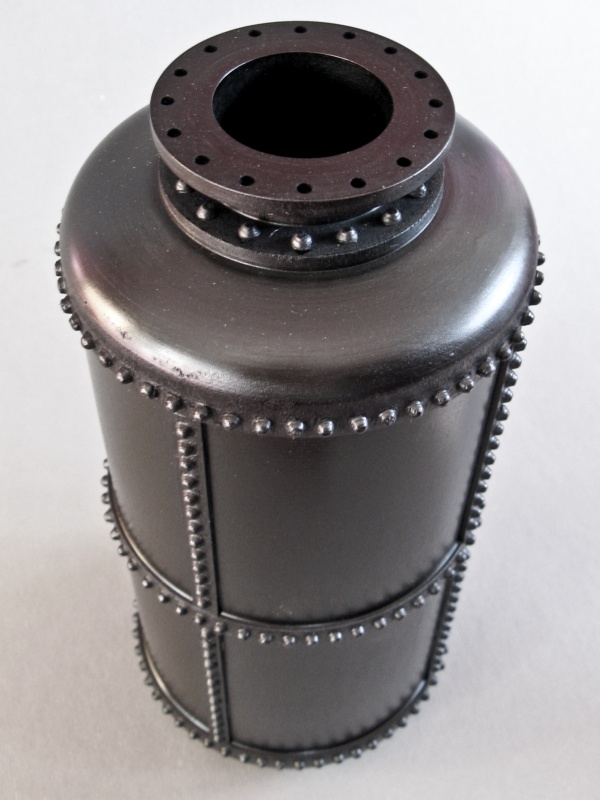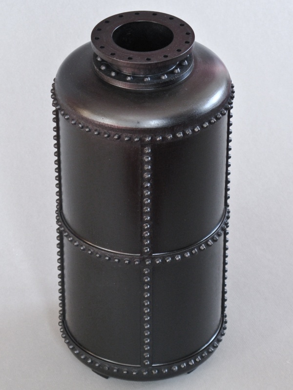 bottle-like; a tallish shape with a hollow interior and usually a narrow opening. In engineering, a pressure vessel is a type of bottle made to handle high pressure. These days, pressure vessels tend to be forged tubing and rounded ends attached with continuous welding. But in the good old days, big thick plates of steel were bent and then riveted together, making a much more interesting (and dangerous-looking) vessel. So I made a wooden version of the antique "pressure vessel" from the days of steam. This piece is modeled on the "butt-strap seam" style of boiler construction where the pieces of steel forming the boiler are butted up to one another, and then straps are added to the inside and outside, and riveted together.