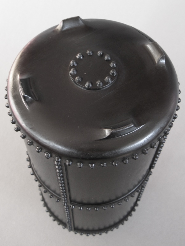 This piece was made of laminated maple pieces, turned and hollowed. The three horizontal rows of "rivets" were formed on the body using a small cutter and then the remaining wood removed by hand. Since I couldn't find anything like the kind of cutter I needed, I ended up fabricating that myself, starting with a Philips-head screw. The "straps" on the sides are separate pieces that had the rivets cut into them before they were glued onto the main vessel. Due to the difficulty of cutting them in place, the rivets on the top flange and bottom plate were formed on a separate piece of wood, and then cut off and glued on to the main vessel. During the turning, a ridge was left on the bottom and was then carved away to leave the four short legs. The piece was dyed black before finishing to get to the "iron" look. There are a few construction details