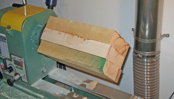 But that wasn't the case here since the joins between wood pieces would be mostly hidden by the finish. Instead I used three 2"-thick planks laminated together for the turning blank. The misalignment of the three glued-together pieces that can be seen in the