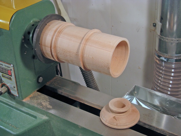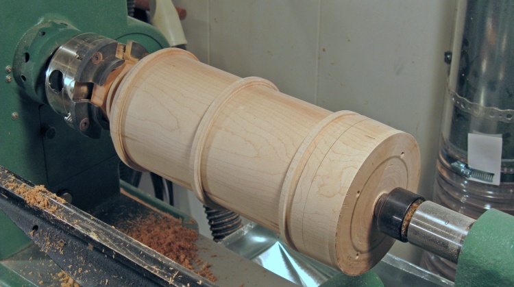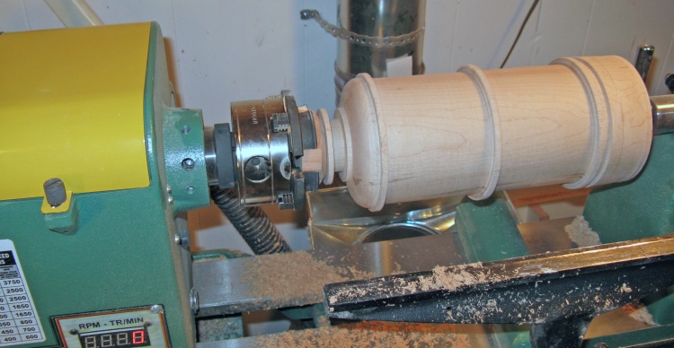 The next step was to turn the bottom. It isn't usually practical to do that kind of shaping at the faceplate end since there is usually little room to get tools in - unless there are several inches of material to cut away just to make room. Instead, I reversed the piece. To ensure it stayed centered, I turned a cylinder of the correct diameter to fit snugly into the top-side hole. With this cylinder held in an adjustable-jaw chuck, and with the top set back in place, the piece was flipped end-for-end. It was supported at the bottom with a live center in the tailstock.