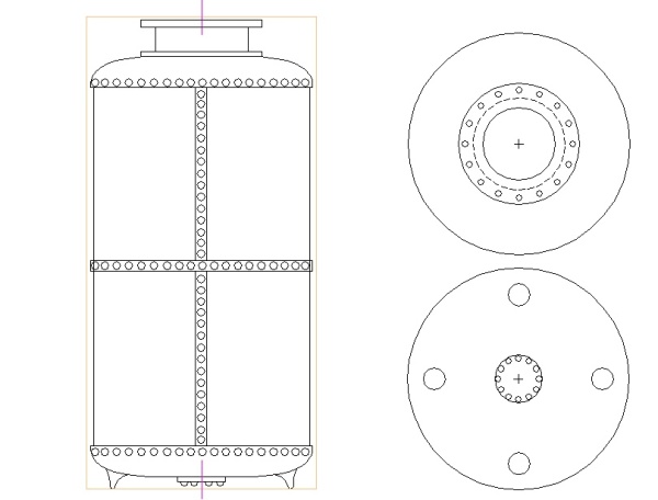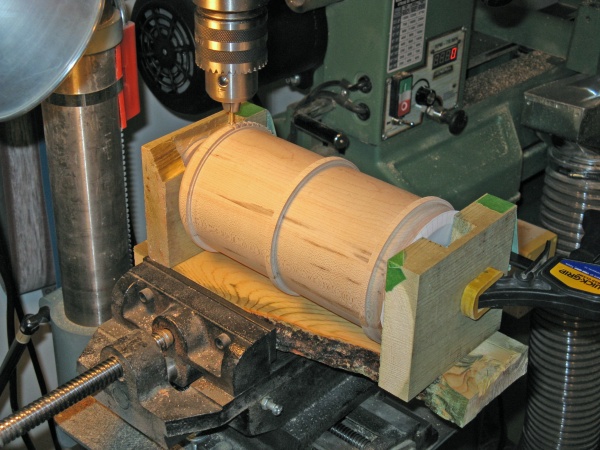 The center shaft was also useful so it could act as an axle. Rivets had to be cut around the circumference of the vessel in three rows (55 per row), which required a jig that allowed it to rotate. I built a crude jig from some old fence boards. It allowed the piece to rotate around the flange at the top, and the shaft at the bottom. With this mounted on the drill press, the piece could be rotated by hand (6.545º, give or take a degree or two) and the individual rivets cut. A round sheet of white paper can be seen on the near end of