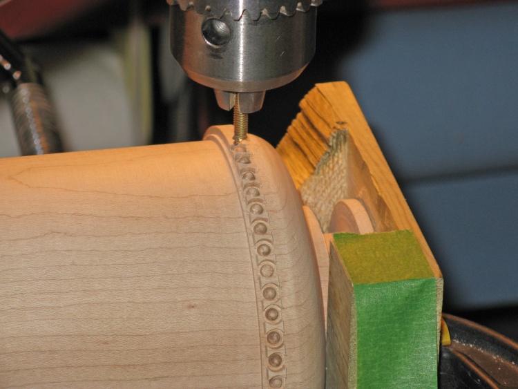 For the vertical sections of rivets, little strips of wood were cut, and the rivets shaped on the drill press in a similar manner as shown here. These pieces were then cleaned up by hand and glued onto the main body. The top was also glued on at the same time.