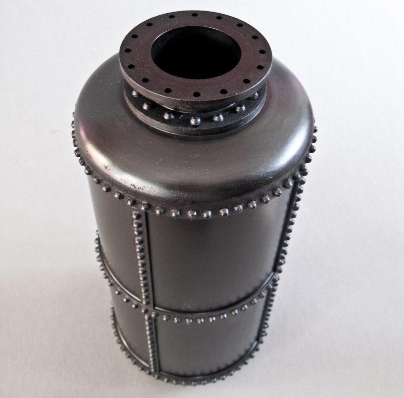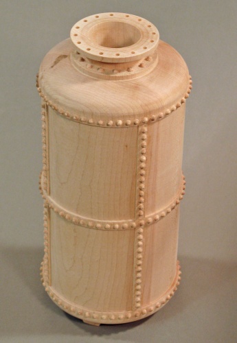 I had seen a carving that reminded me of structural steel, although I'm not sure that was supposed to be what it looked like. It had sort of a black, early-20th century gothic-ish look to it that I found attractive. I thought I would try to make a piece that had a similar metal look to it. Since I was breaking in a new lathe, it made sense to make some type of vessel, and the idea for the "Pressure Vessel" was born. I also decided I liked carving more than turning, so I used the lathe to make a blank to which I added carved details.