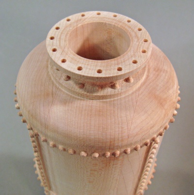 This shows the hollowed inside of the vessel. I kept the walls around 0.2" in thickness for strength. The three pieces of wood forming the body can be seen as lines between the differently-grained sections.