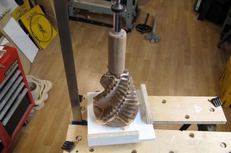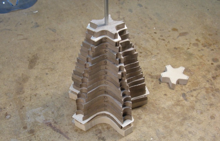 A 1/4" steel rod was used as a guide onto which the layers were fitted. The pieces were also numbered to make sure I didn't miss a layer when doing the gluing.