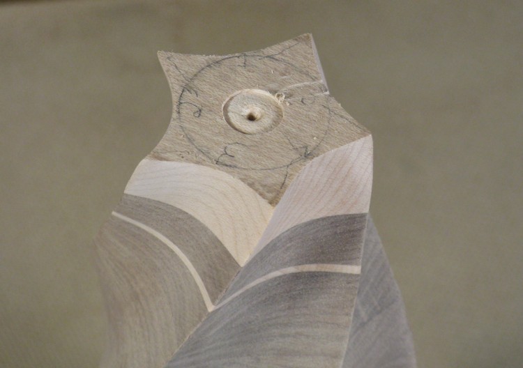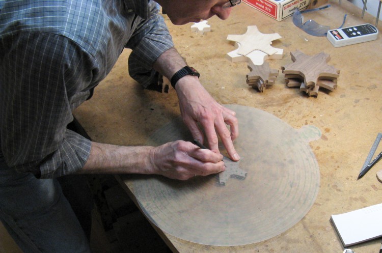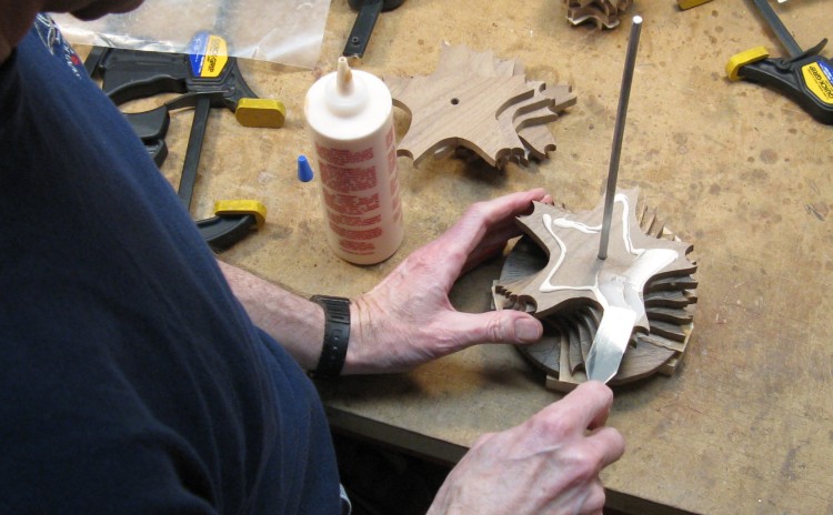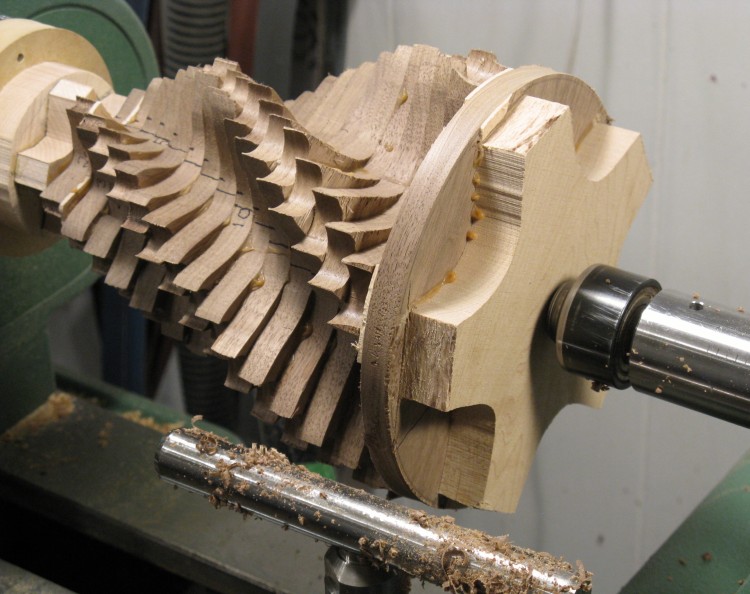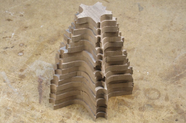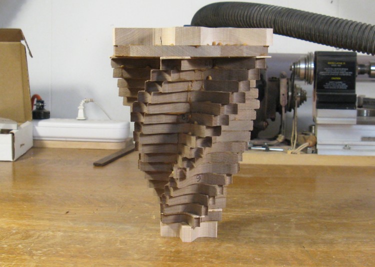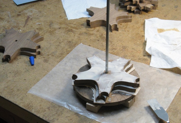 This photo shows the first few pieces being glued together as it gets assembled upside-down to how it will eventually sit. On the bottom of the pile is the vessel top, then the round layer mentioned above, the thin maple accent layer and then a couple of normal walnut layers.