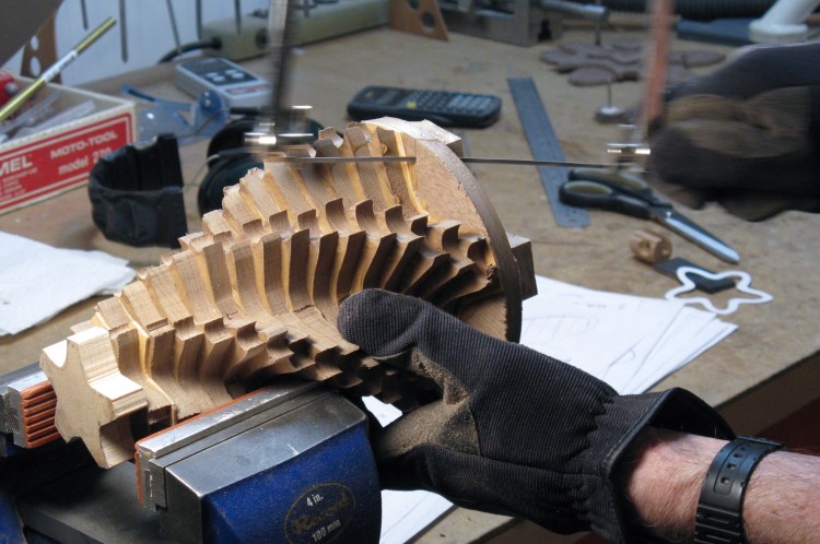 With the inside done, it was time to start taming the spikes on the outside. The first step was to make the disc layer look more like the other layer shapes, for which the coping saw was employed.