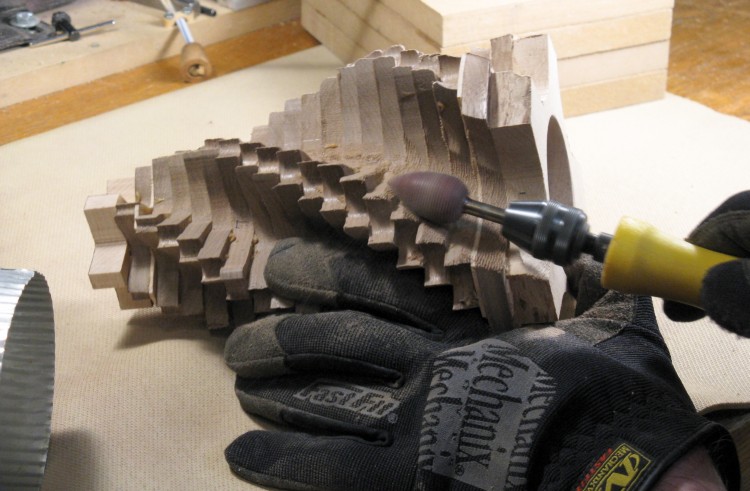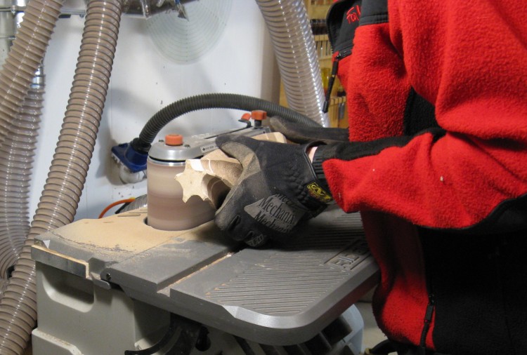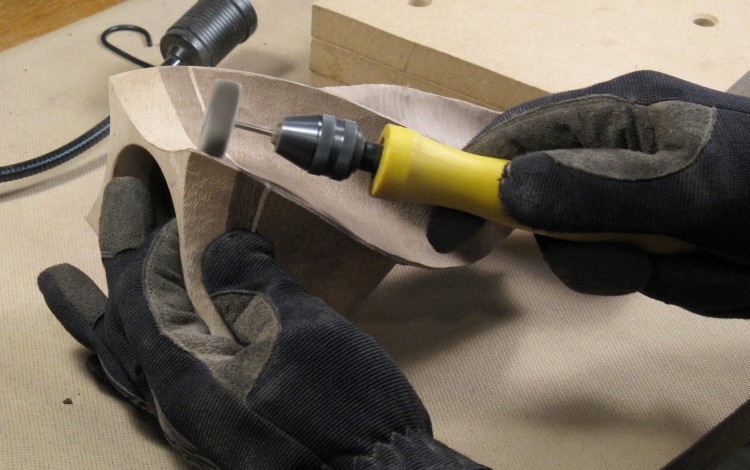 The slightly awkward-looking hand positioning seen here was adopted so the turning direction of the burr would direct the sawdust to the dust collector hose seen here. This worked well enough that I didn't need to wear a dust mask.