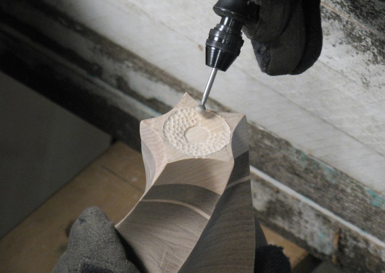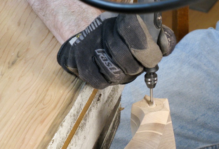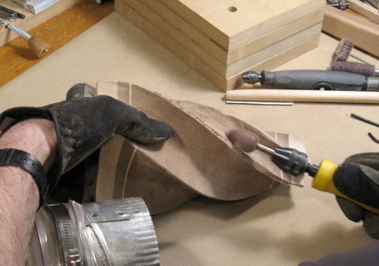 I used the Dremel with a flat-surfaced cutting bit to deepen the hole. Here I stacked some planks beside the vessel to give me a place to rest my arm at a convenient height for a steadier hand on the Dremel.