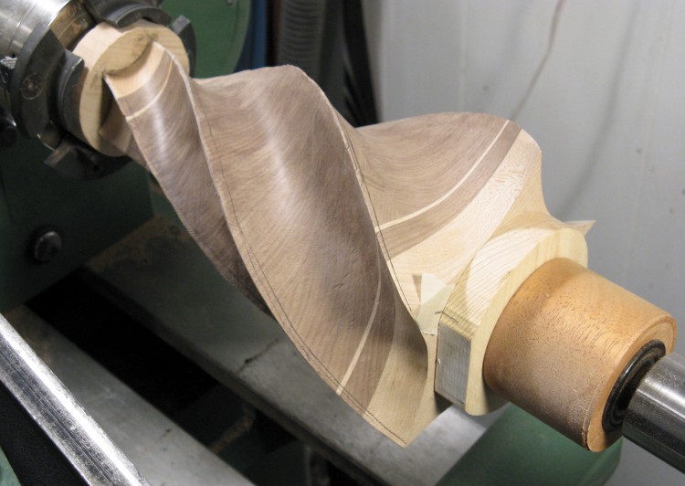 With the edges mostly done, I decided that they were a bit long and should be equalized to make them closer to the same contour. I mounted the piece back on the lathe to mark the edges consistently to give new targets to work towards.