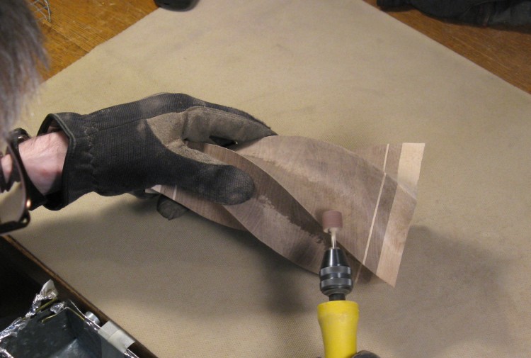 I switched over to an 80-grit flap wheel sander both to thin the edges a bit more and to smooth off the rough surface left by the burr.