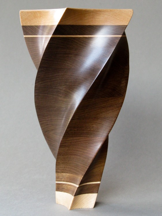 This vessel has a lot in common with the one that gave birth to its pieces. Obviously it was going to be the same walnut in the same layer thickness, but I replicated the maple top and bottom and even added a similar thin maple accent line. This could be described as a common design theme to tie diverse shapes into one unifying motif. Or maybe just "stuck in a rut".