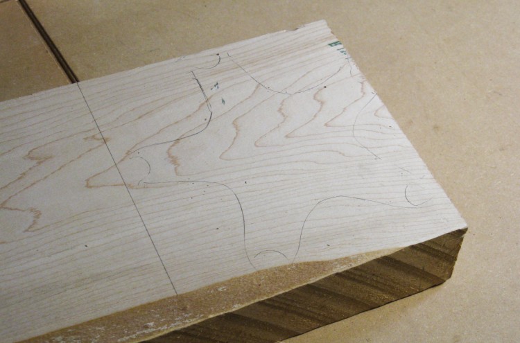 So, instead I marked the thickish piece of maple shown here with a size appropriate for the top of the spiral vessel, and cut another to be used for the bottom. I also used a thin sheet of maple and cut out pieces for the two "accent" lines near top and bottom.