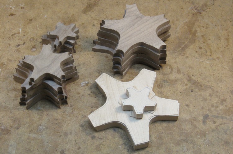 The "donor" project had walnut layers that needed the centers cut out to form a hollow vessel. This is one of the smaller ones being cut out on the jigsaw. I had drilled holes at each point to make the cut-out process easier, which left the resulting center pieces with a peculiar hollow-ended rounded star shape.
