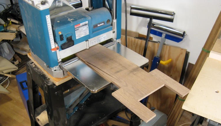 I needed at least one of the layers to be nice and round. This shot shows a walnut plank being planed to the same thickness as the other layers before I cut that nice round piece out of it.
