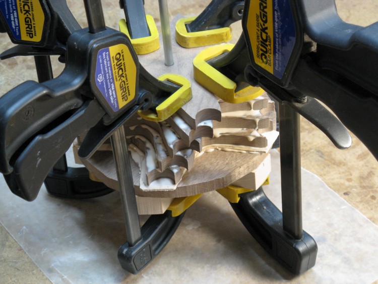 I added a few more layers to the stack started above, made sure the pieces were offset from each other the right amount, and then clamped them all together. I had waxed the metal rod to prevent the glue sticking to it so as to aid in its eventual removal.