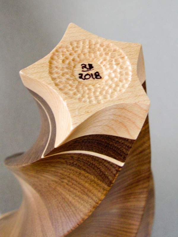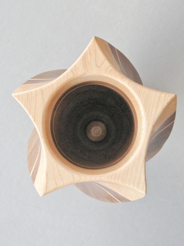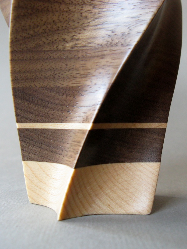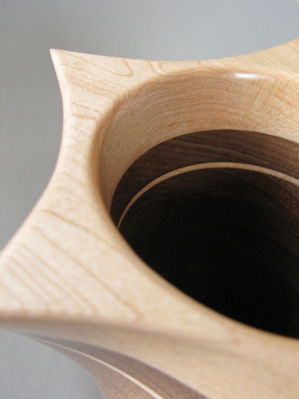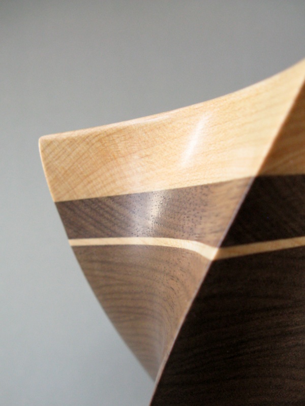 Due to its origins, the spiral vessel of course shares the same walnut in the same laminated style as the star vessel. Forming the outside was also a similar manual shaping process, however the inside of the spiral was turned on the lathe rather than shaped. I continued with some common themes like contrasting top and bottom and a couple thin accent lines in maple. In general the construction