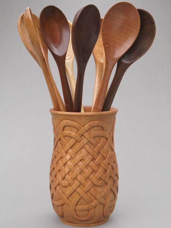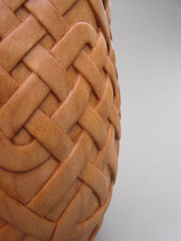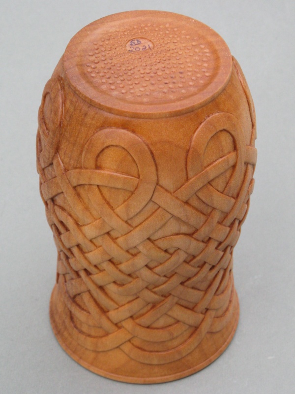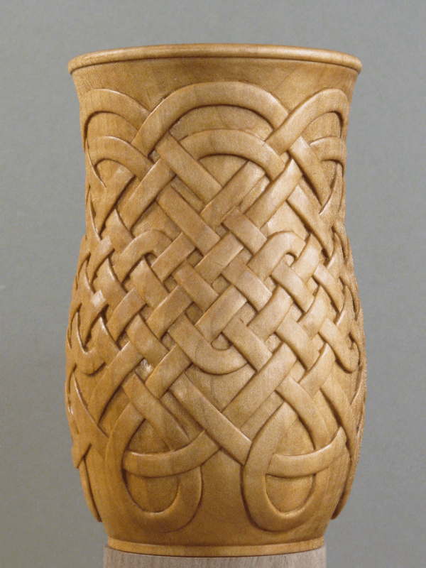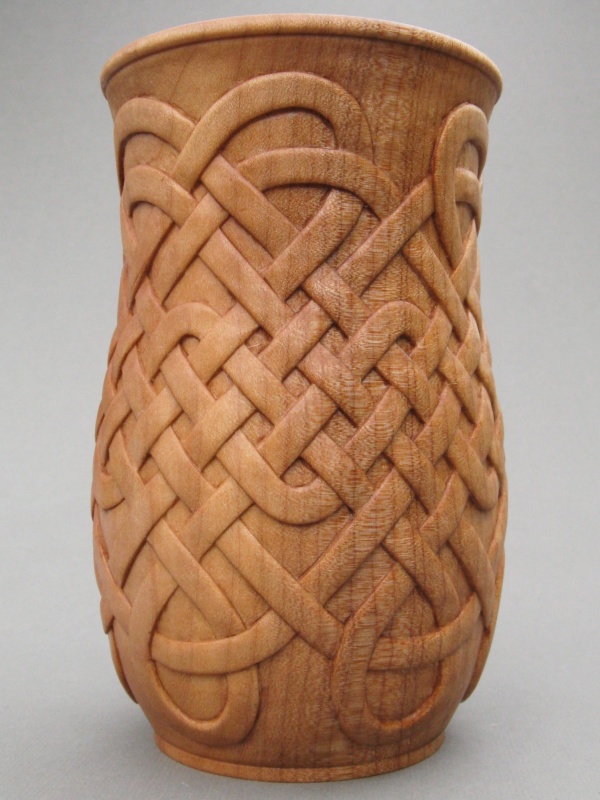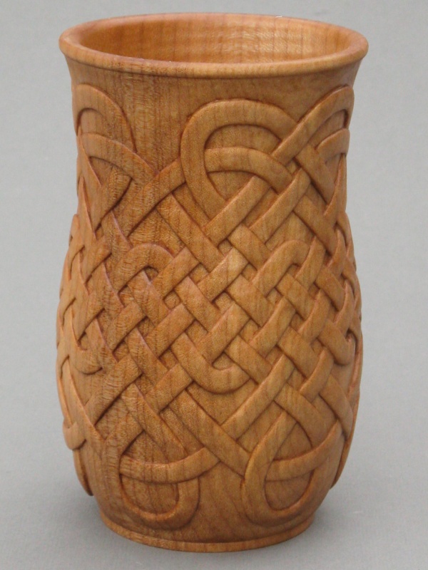 The resulting vessel fortunately doesn't look much like a plastic yogurt tub but it's definitely related by the critical dimensions. As to design, the last vessel I made was segmented so of course this one needed to be different; it was turned out of a single block of Western maple. I also wanted to do some sort of carving and after much unseemly dithering and several test carvings it finally came down to either a woven motif or a Celtic knot design. I kind of liked them both so what I finally