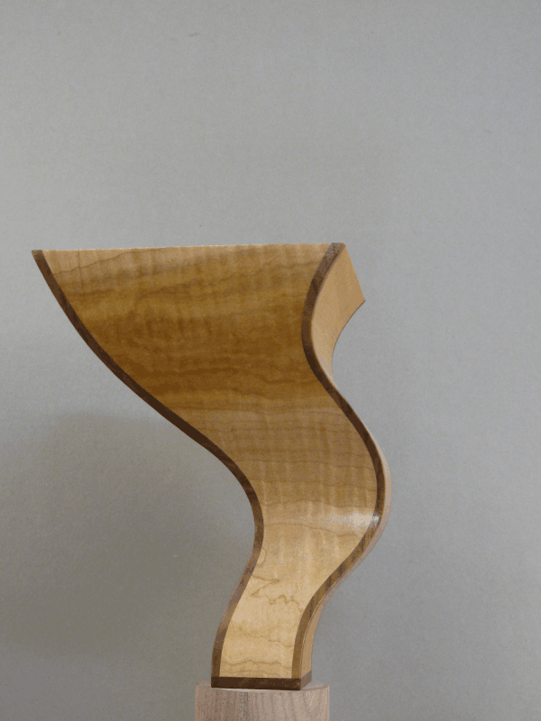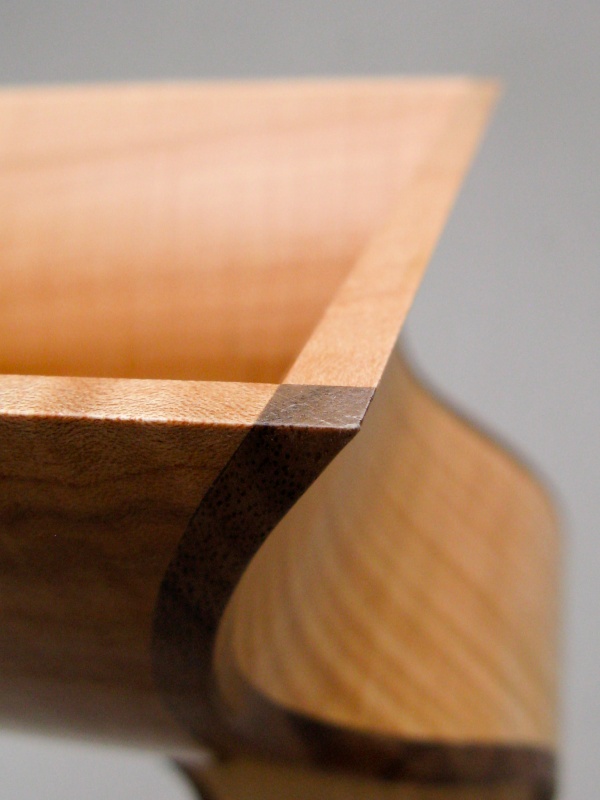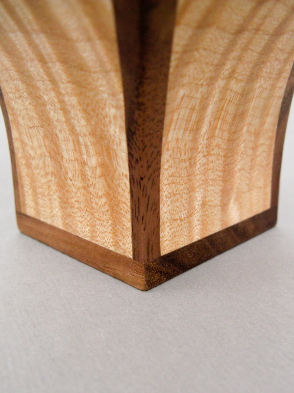 The original concept for this guy was to join the sides with box joints (intersecting square fingers) so after making the sides I tried a sample piece with, well, less than spectacular results. Turns out making precise box joints on two pieces with variable curves in two dimensions is kind of tough. Who knew? Anyway, that wasn't going to fly so I switched to Plan B which was to make contrasting corners with butt joints. For that I merely needed to precisely match the arbitrarily-curved edges in eight joints, but that turned out to be more achievable than the box joints, which I describe in mind-numbing detail