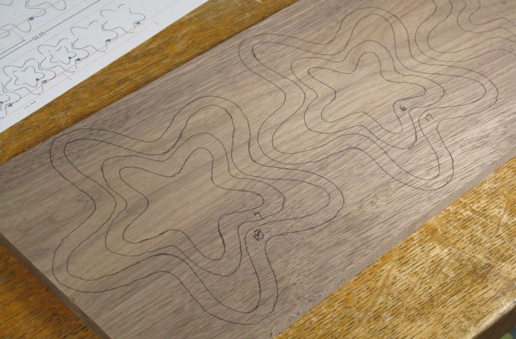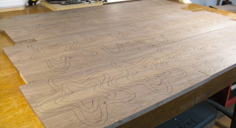 Here's plank #4 (the narrowest one) with the shapes traced out. I was able to use some concentric patterns to be a bit more efficient with wood use.