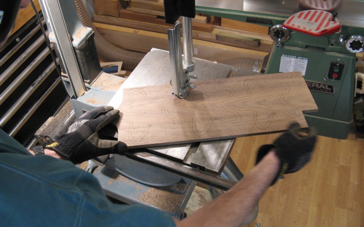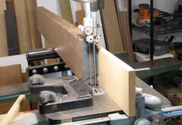 The first step was to resaw it into thinner sections to get to the 0.4" that I had planned for the main layers. This shot shows the first cut, which produced two 1"-thick planks.