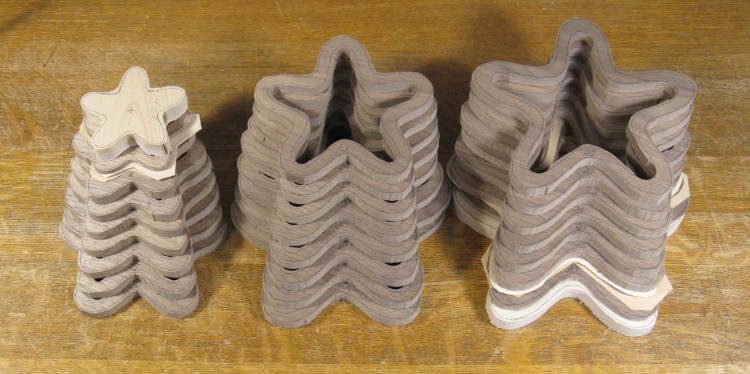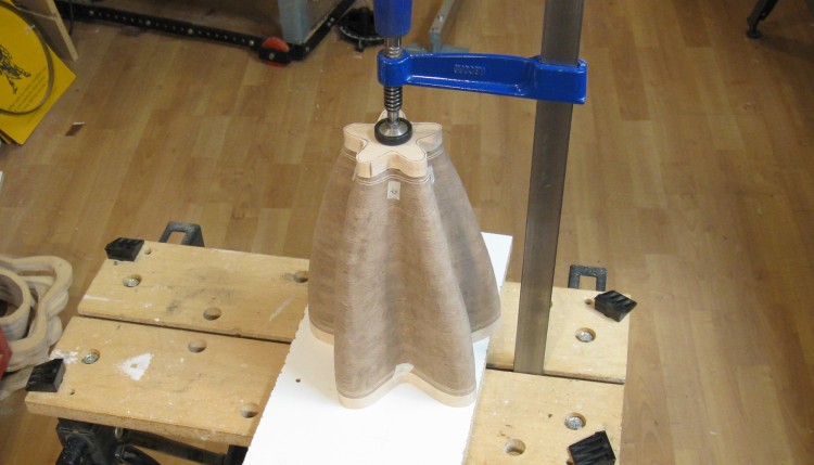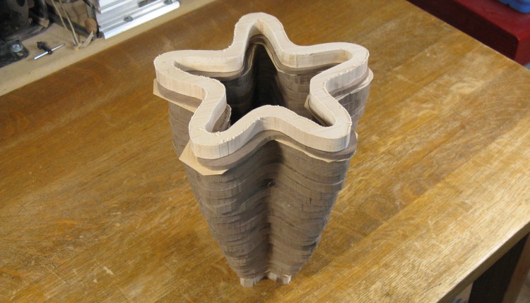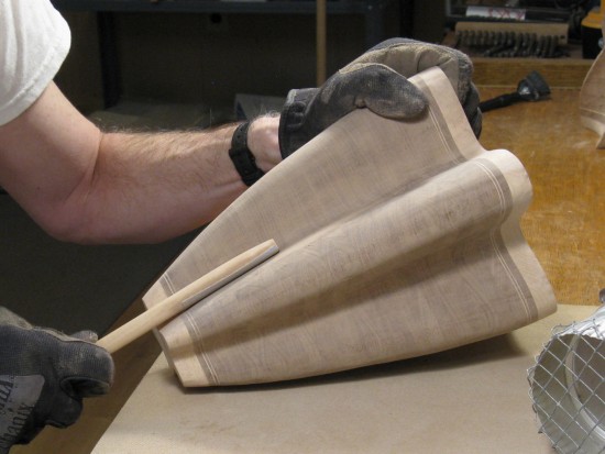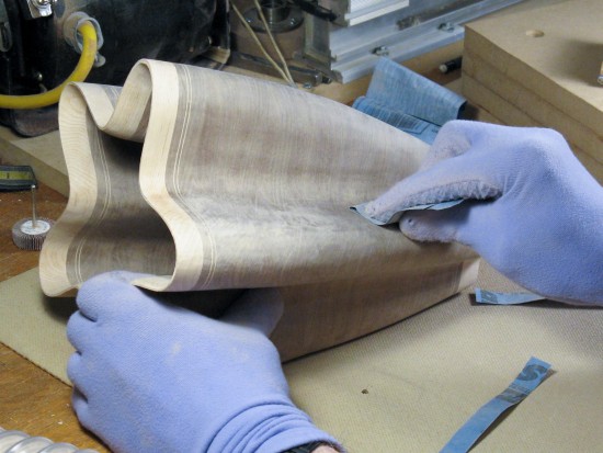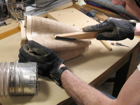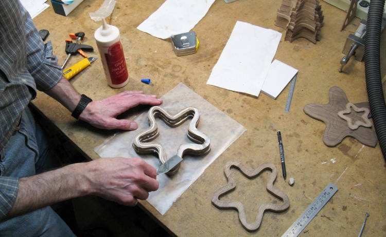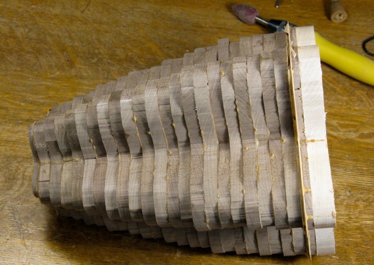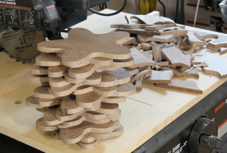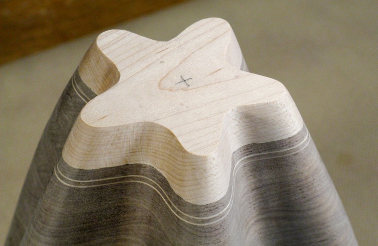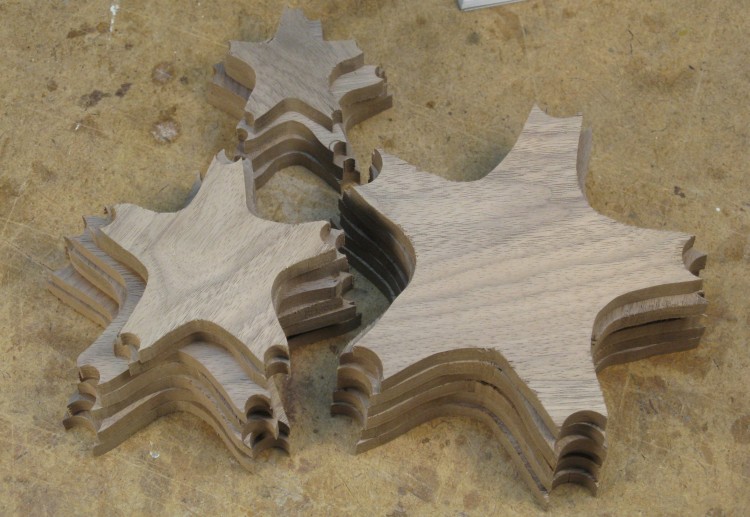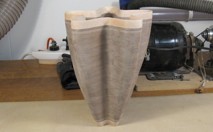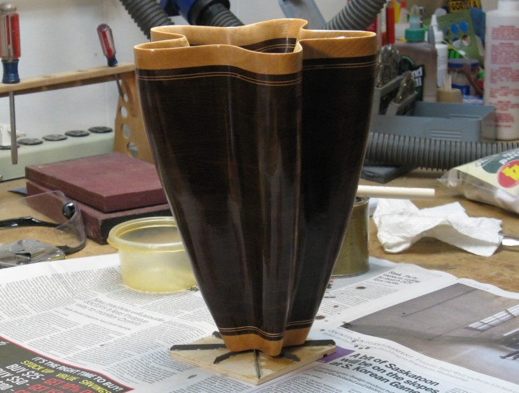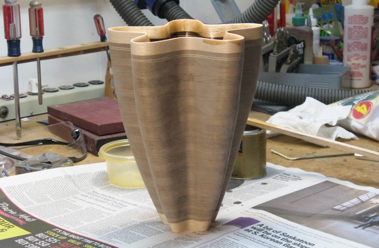In addition to the walnut, the vessel needed maple layers as well. This shot shows three of the four thin maple layers, cut out from sheets of veneer.