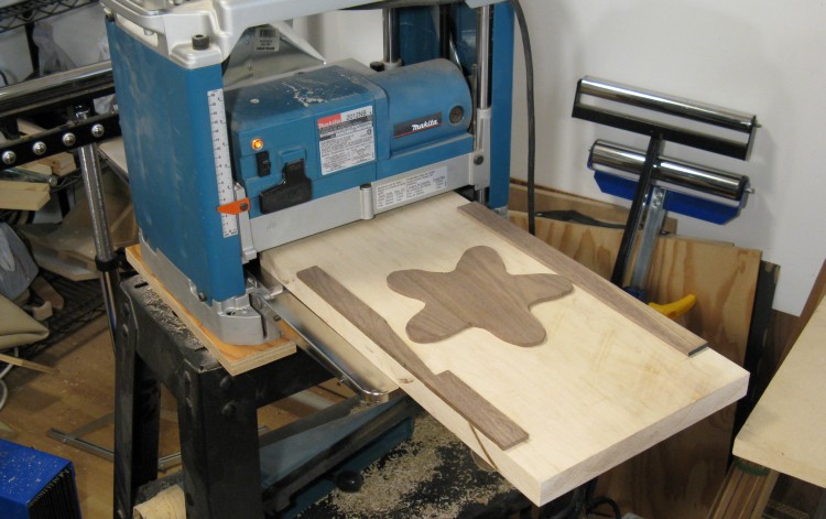 The planer doesn't go down to zero, so for thin pieces I tape the piece to a sled (AKA maple plank) left over from another laminated vessel project. The walnut pieces on the sides perform the anti-snipe function.