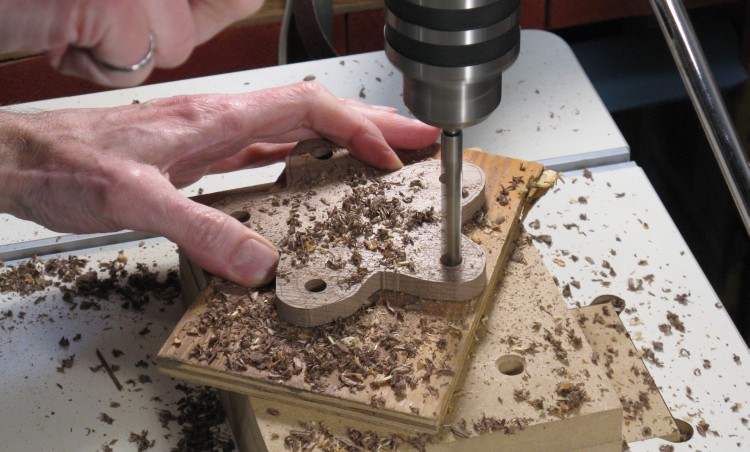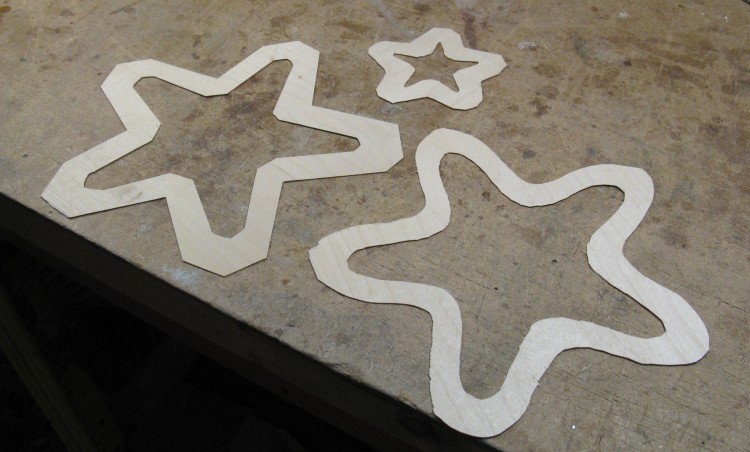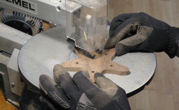On the jigsaw, the blade can be removed, inserted through a hole in the wood, and re-attached to start the inside cut. I did this using just one of the holes, and then cut from hole to hole - that way I avoided having to cut the tight curves at the ends of the lobes.