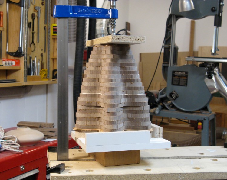 One complication to the gluing was that I decided to flip every second layer so that the grain on adjacent layers would show a bit more contrast. As a result, I needed to keep track of the orientation of the pieces in adjacent stacks.