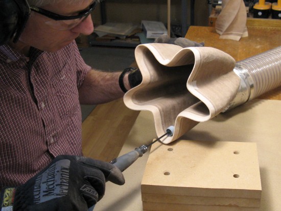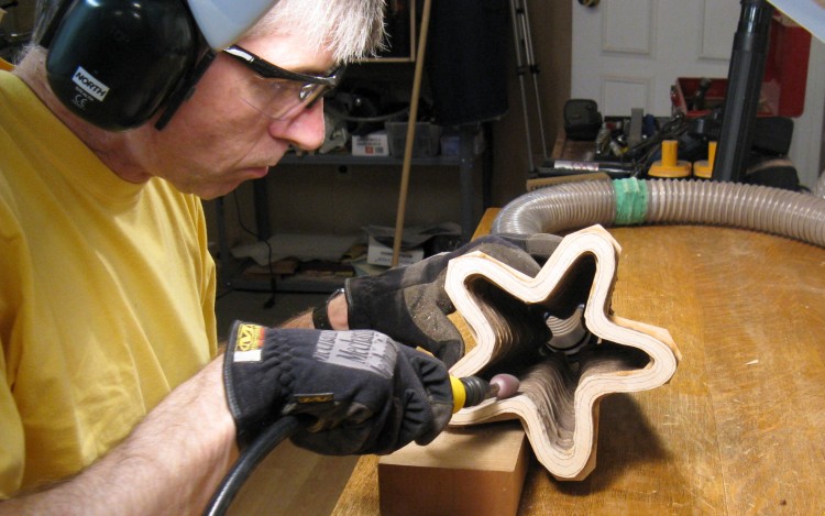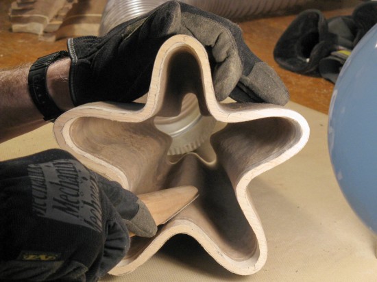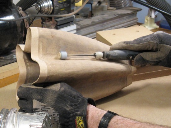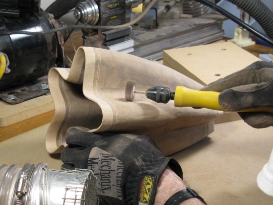 I was actually concerned at the start that it would be impractical to reach inside the lobes all the way through the vessel to do the necessary shaping and sanding. However, using a combination of the main carving shaft and a smaller Dremel shaft and working from both ends, it was merely awkward. Ok, and there might have been the tiniest smidge of tedium in there too.
