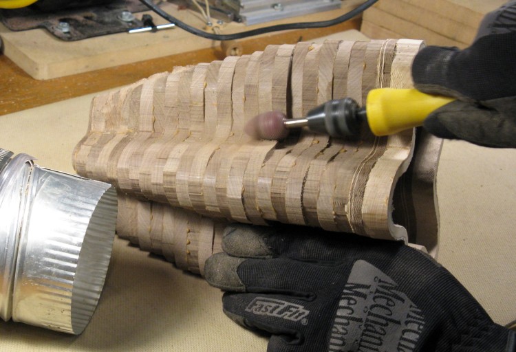 At that point, the shaping could start. It largely consisted of smoothing between the layers and removing material to get to the proper wall thickness and overall shape. I'm starting here on the inside, and using my main shaping tool which is a coarse carbide burr on a flexible carving shaft.