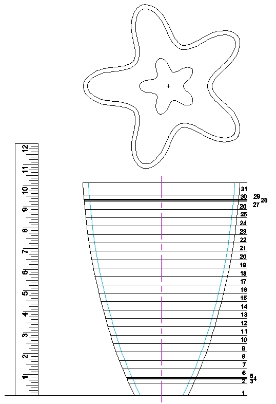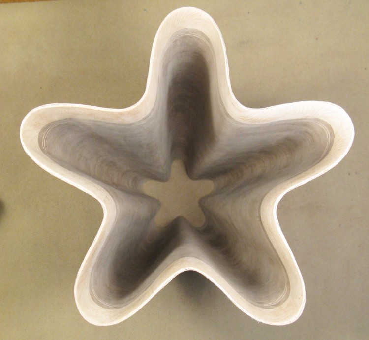 I liked the more-interesting curvature possible with a carved vessel like the previous "irregular vessel" I'd made, and thought to try another with a few different features. One of the goals was to make sure it was sufficiently different from the previous one. I wanted deeper curves so I went with a 5-sided (or perhaps 5-lobed) shape to squeeze in more curves. The visible plies were a big feature of the previous vessel and I didn't want to replicate that so I opted for solid wood. That would give either more-subtle visible plies or perhaps look like solid wood - either outcome was fine with me. I did keep the contrasting base and cap and it gained some accent lines at top and bottom. So this vessel isn't directly related to the earlier one, but is probably the same genus (stackus contrastus) if not species.