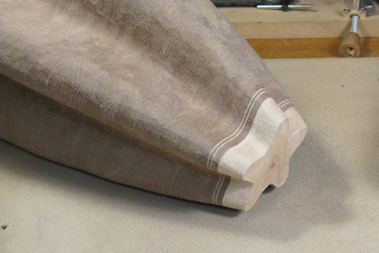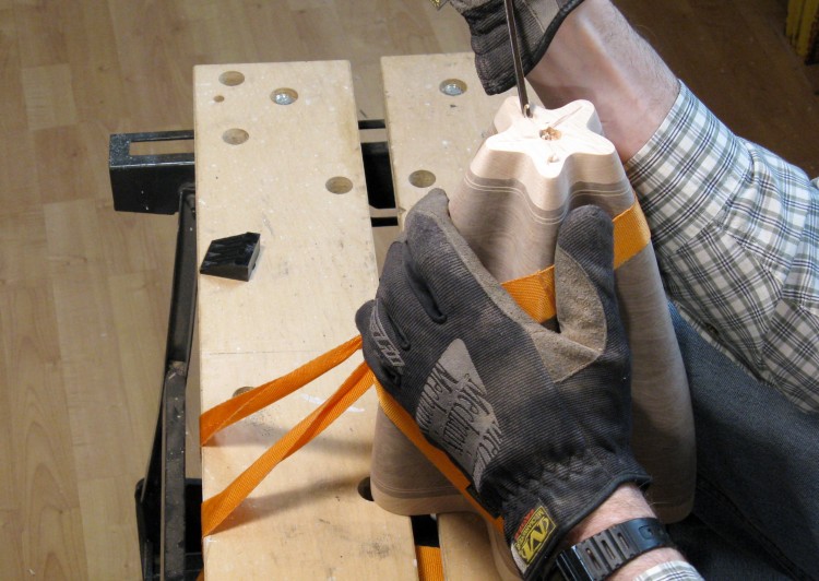 I tried the carving concept out on a maple scrap and it seemed to go okay, but that was with the scrap held in a vise. How was I going to hold this tapered, smooth, non-round vessel solidly enough to carve it without messing up my nice sanded surface?