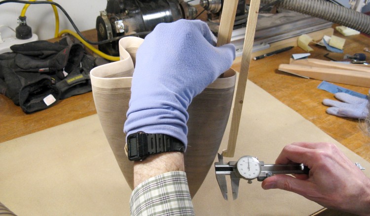 When doing the shaping and sanding, I kept an eye on the wall thickness. Sanding a hole in the wall would have ruined my whole day. I didn't have any thickness-measuring tools that extended deep enough, so I made this fine metrology instrument out of some scraps.