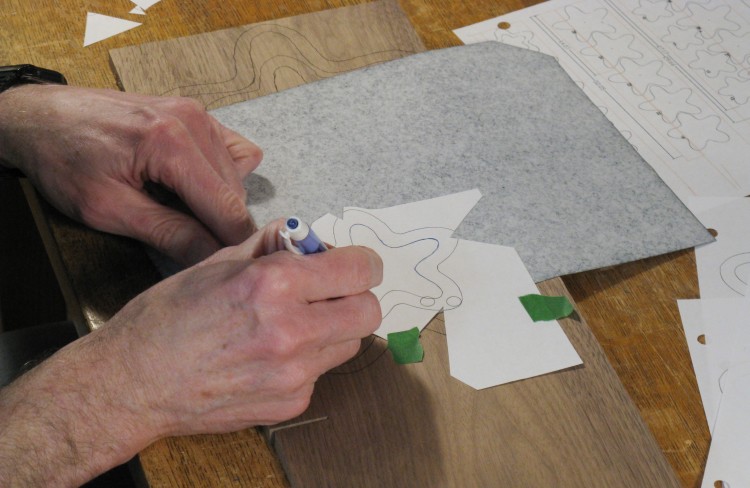 Then with the planks smoothed and at the correct thickness, it was time to start tracing the patterns onto the wood. As usual, I used my standard full-sized-plan-with-carbon-paper technique as shown here.