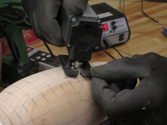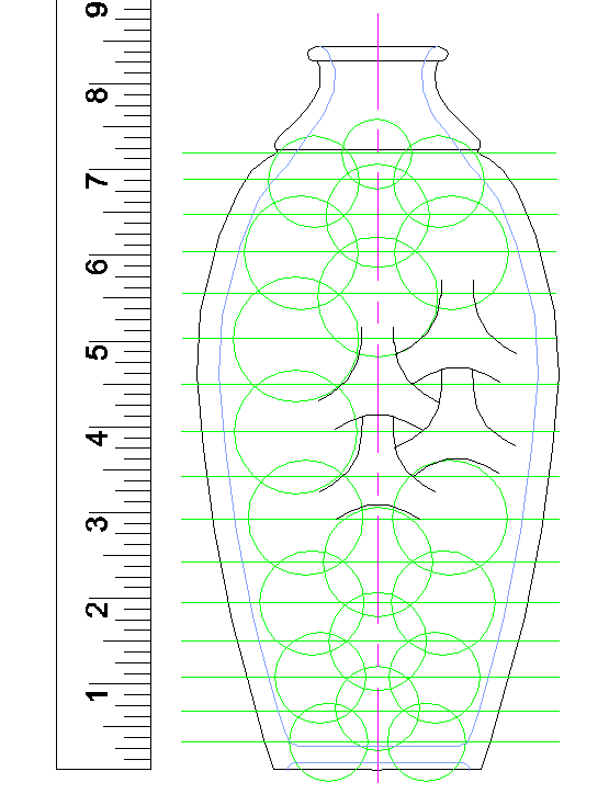 This shows one of the patterns being traced out on the vessel. I had manually added alignment marks but their limited accuracy and small errors in the pattern cutting gave lousy results.