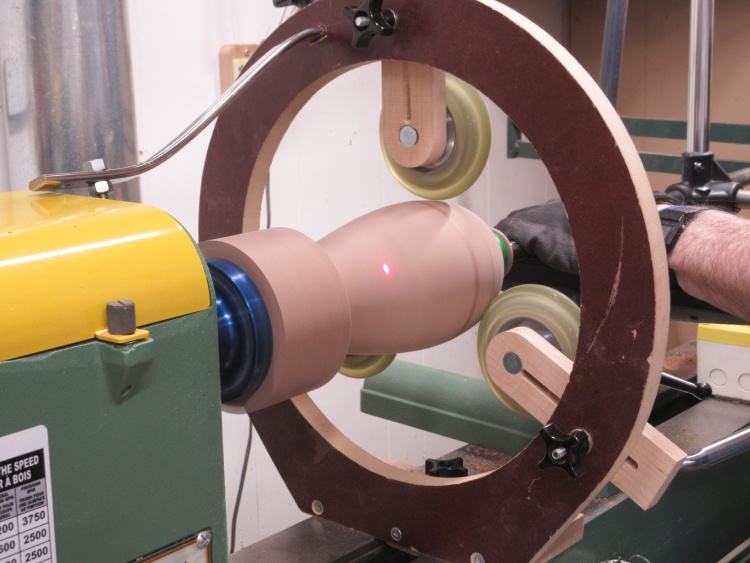 Once the outside was done I switched to hollowing using my usual setup. In this photo the laser dot shows that I'm maybe 2/3 of the way to the bottom.